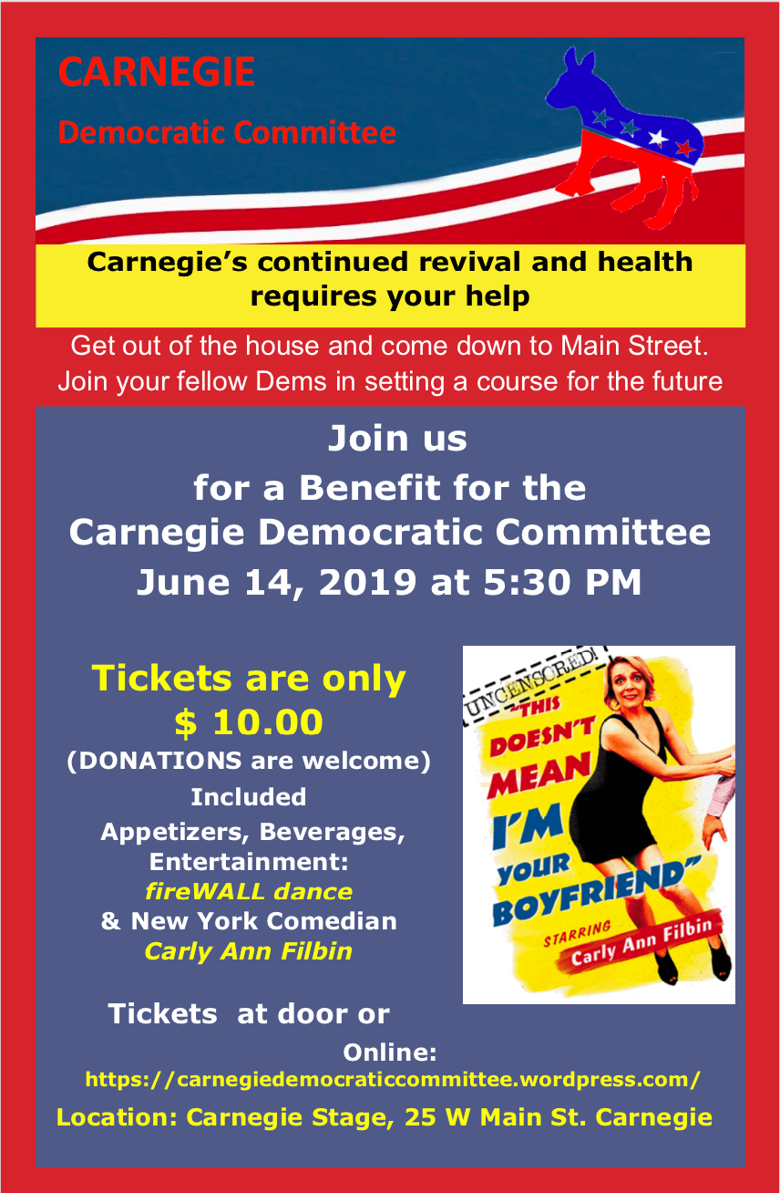 Mixer and Entertainment to Benefit Carnegie Dems Tickets available here Share this:TweetMore Share on Reddit (Opens in new window) Reddit Share on TumblrLike Loading...
